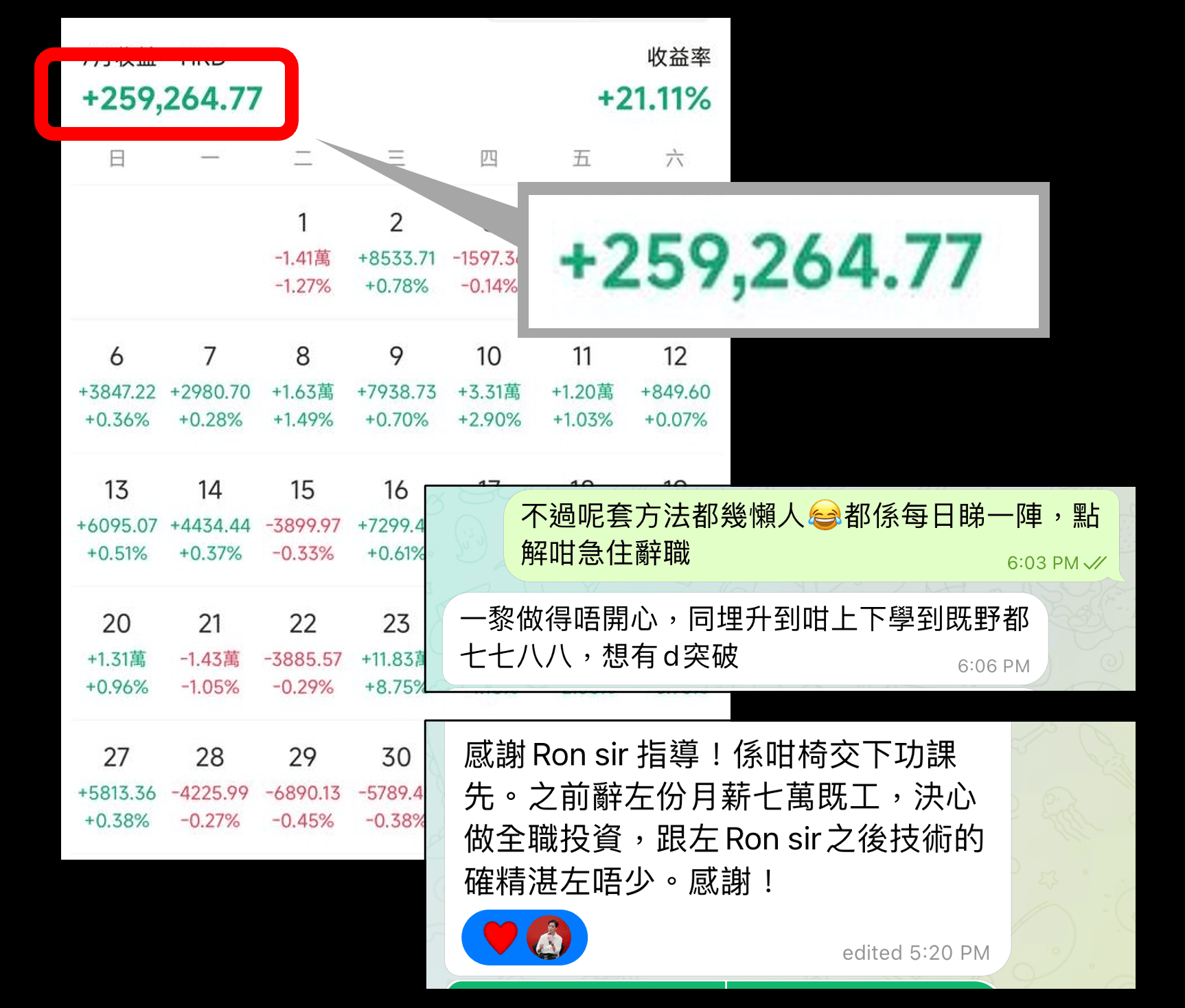“最正嘅係RON Sir令我在短時間內搵到一啲爆升股,做到持續獲利、不斷複利,輸粒糖贏大包糖!”
