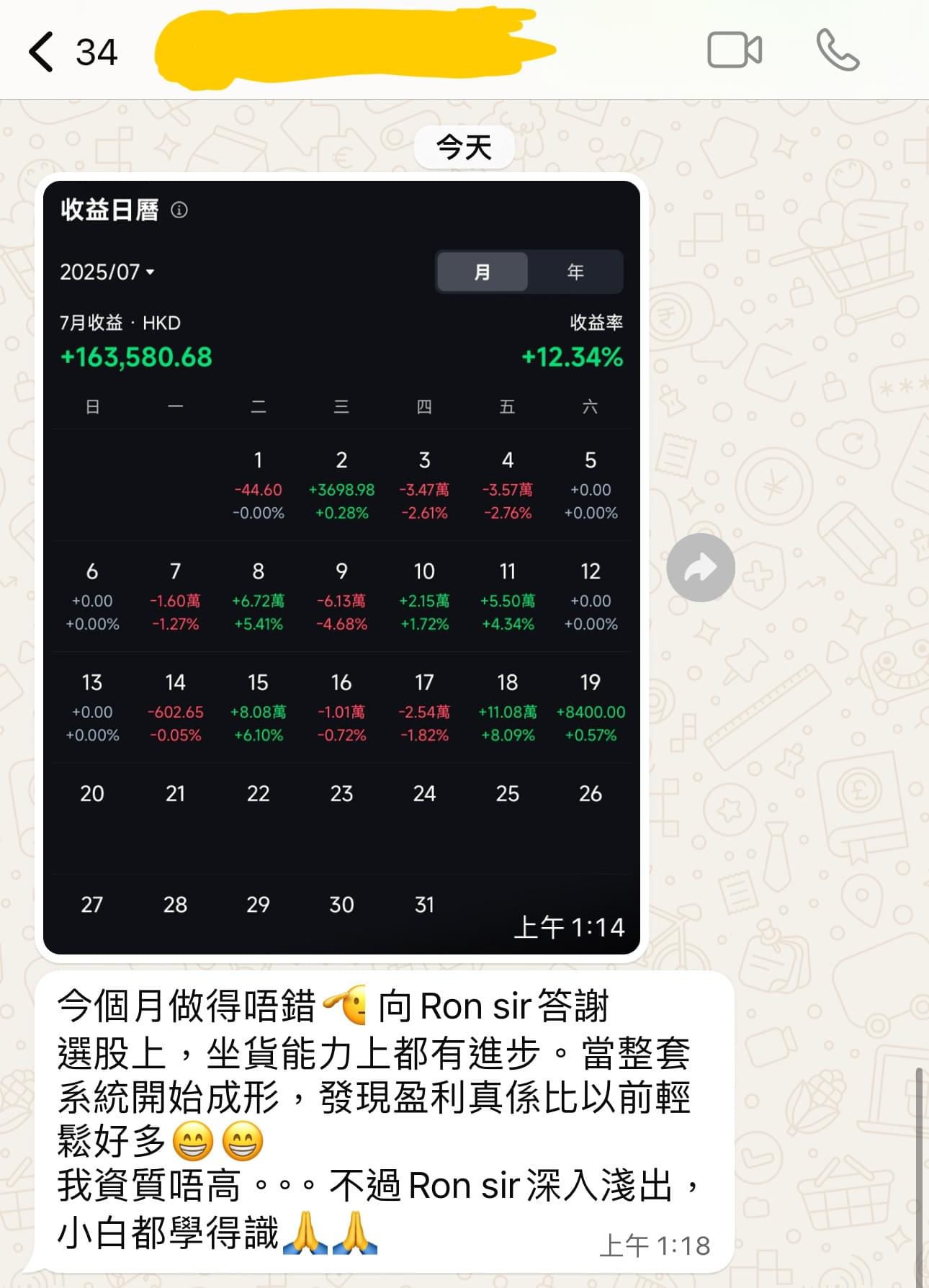 “跟左RON Sir一個多月,幫到我在買賣上很多的決策...亦很感激能在Group裏面有大量發問機會,唔識問到識!”